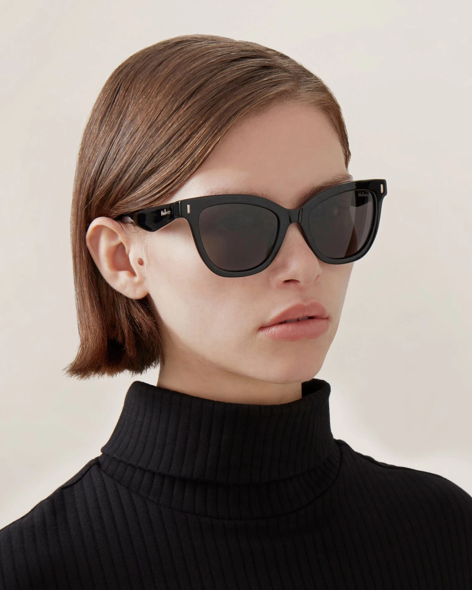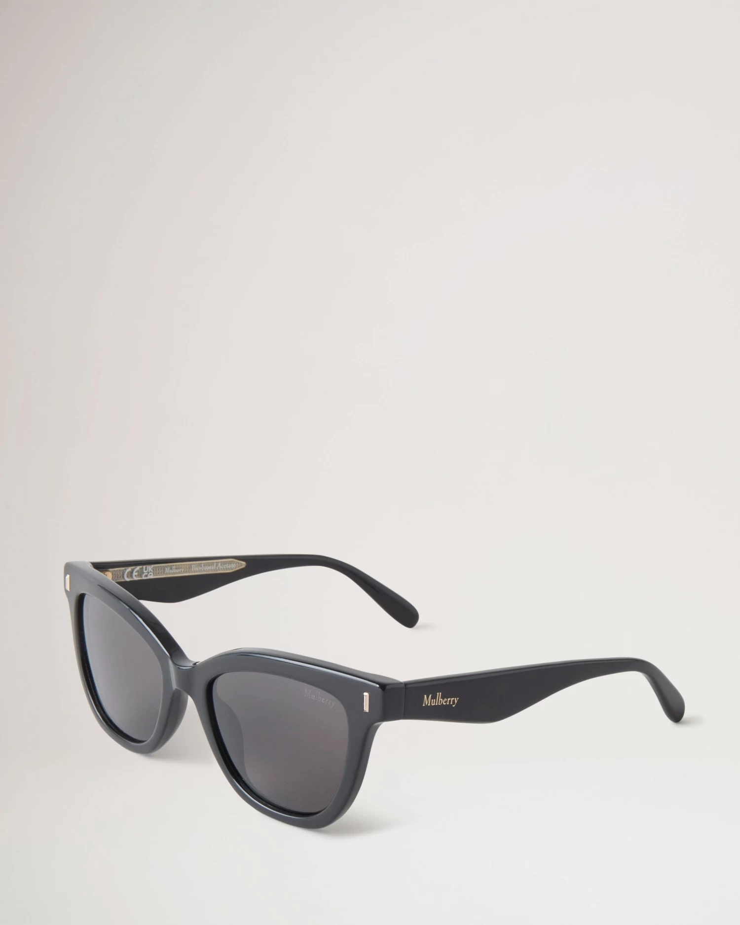 Our Annie Sunglasses: a pair of elegant and refined cat eye style sunglasses, featuring metallic Mulberry branding at the temples. Available in a range of colours.