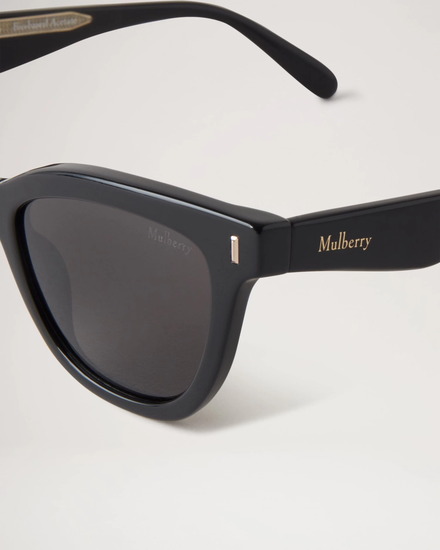 - Mulberry metallic branding at temples