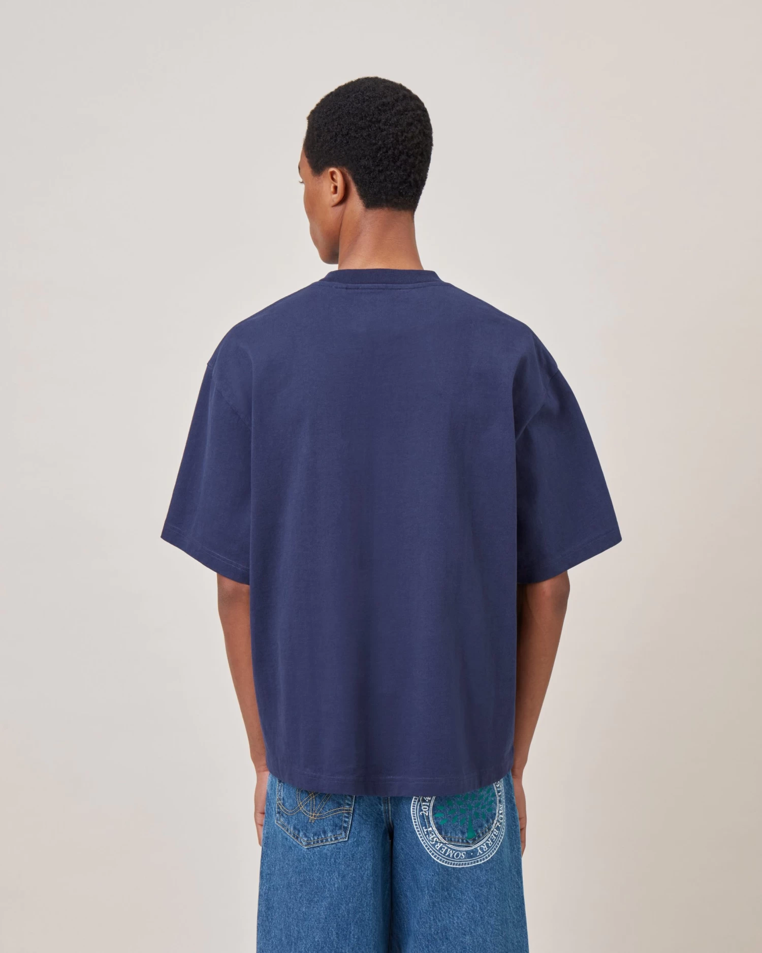 An oversized Box Fit Tee composed of 100% organic cotton, and featuring a print and embroidery collaboration crest on the chest. Available in both White and Navy.