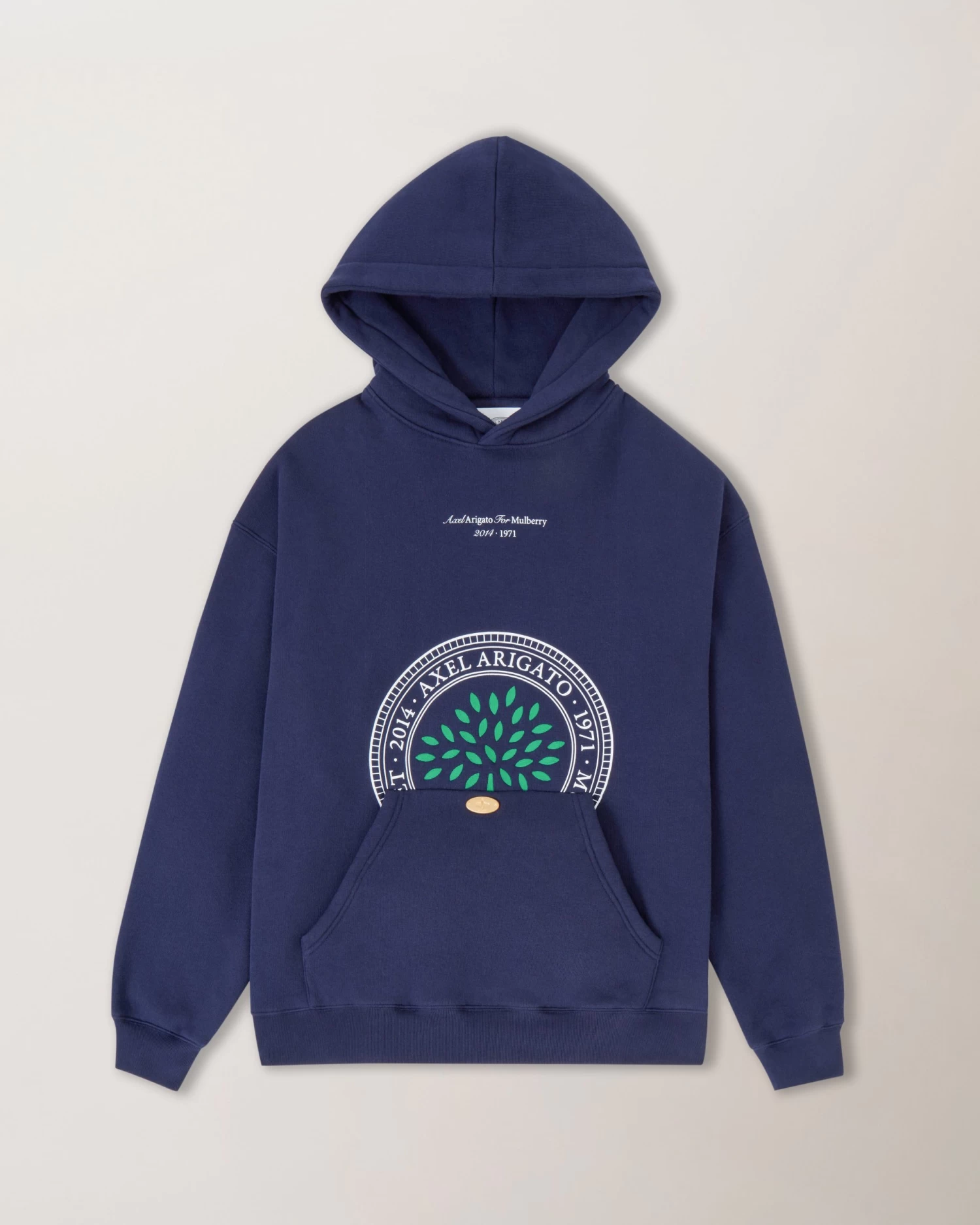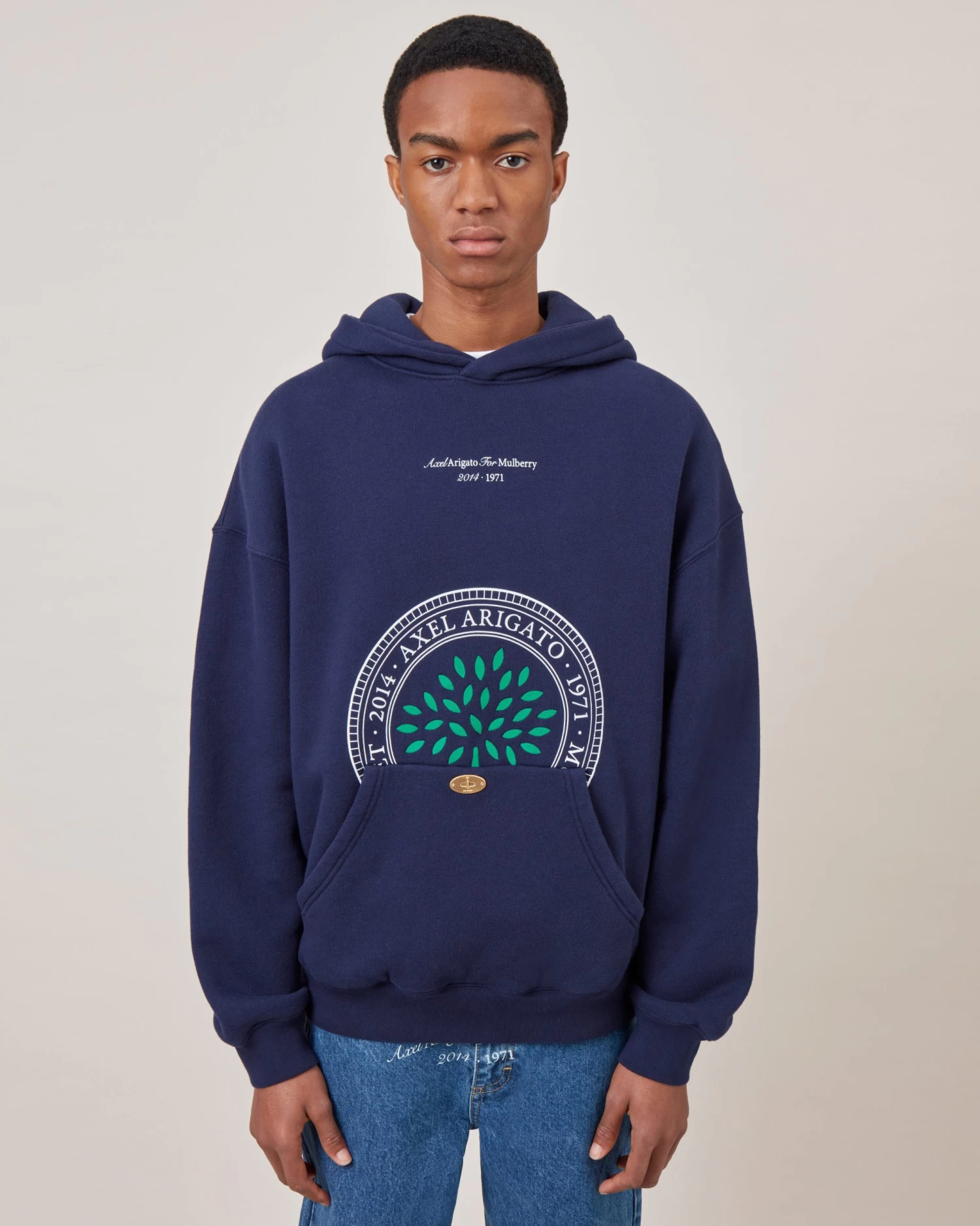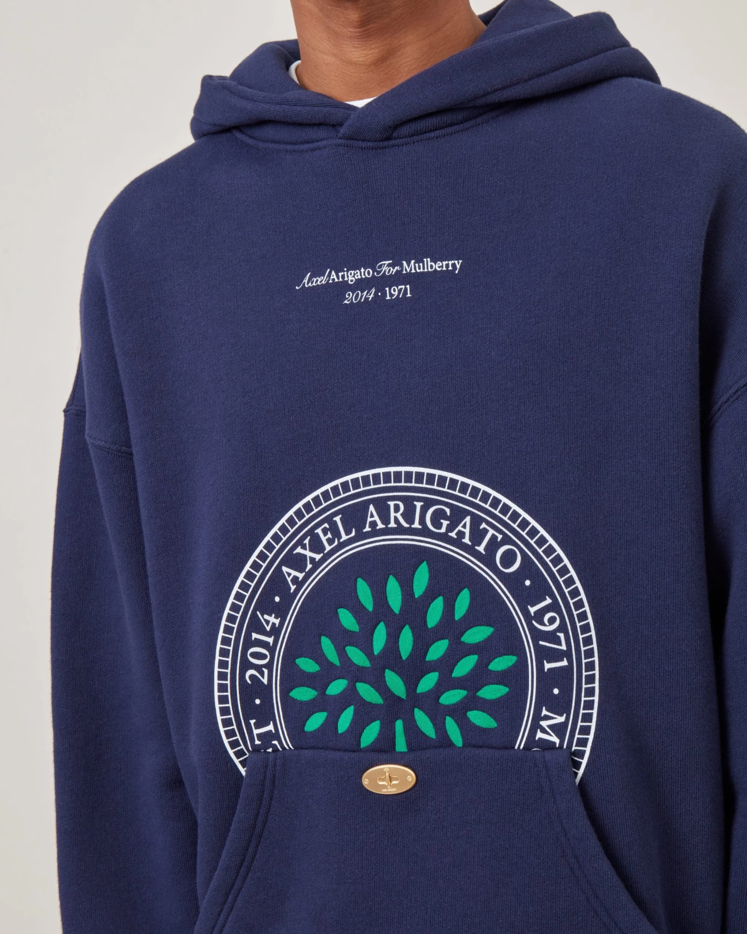 This slouchy, oversized navy hoodie features an embroidered and printed collaboration crest, whilst the iconic Mulberry lock is reimagined as a removable pin.