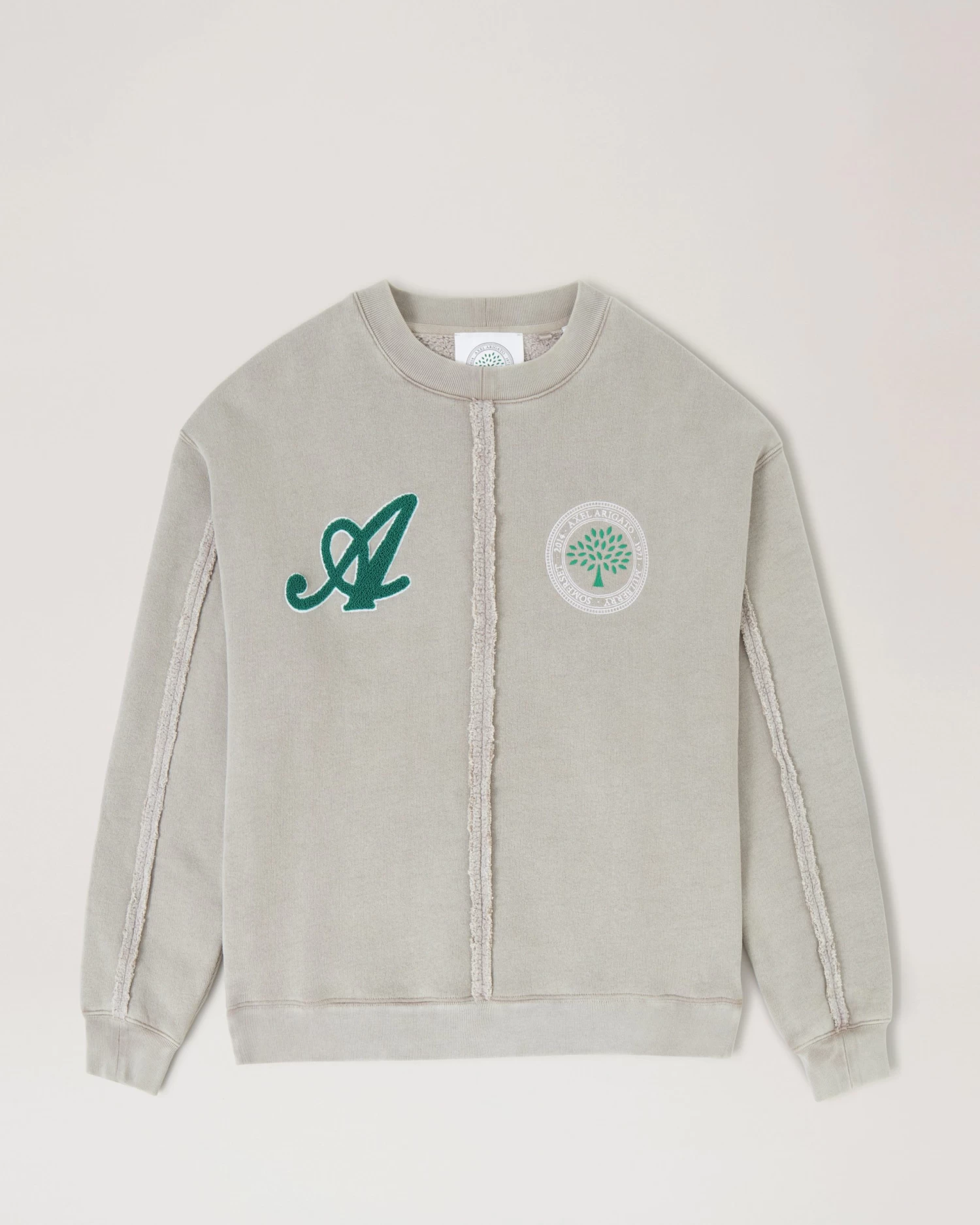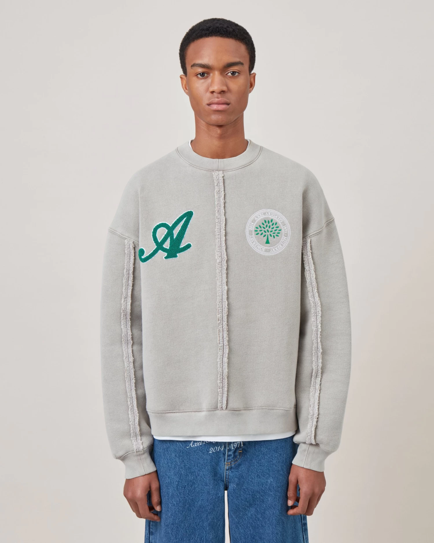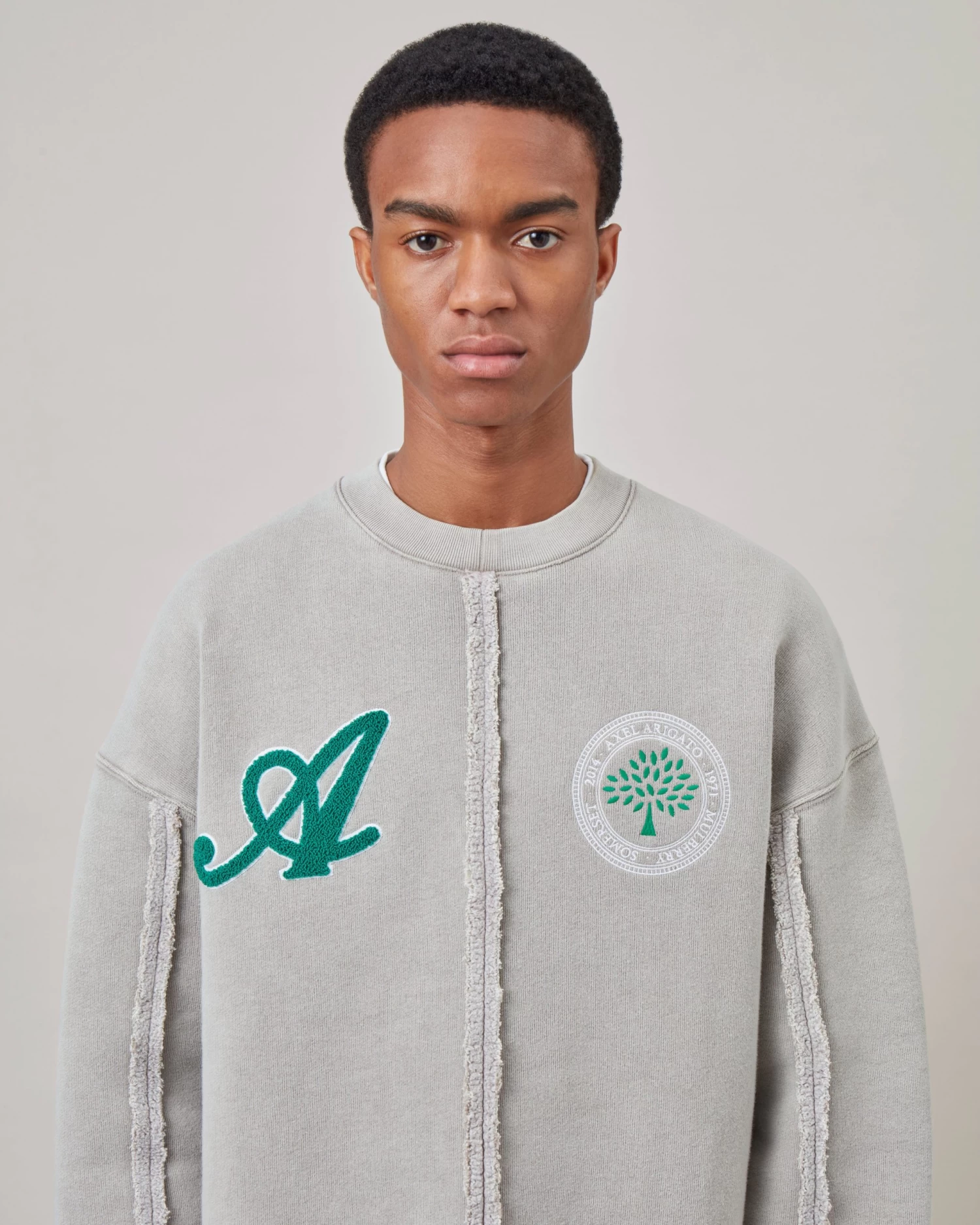 This beige old dye sweater, in a heavyweight cotton fleece material, uses specialist dying techniques to create a distressed, “used” effect –– whilst also ensuring that each individual piece is unique. A varsity-style Axel Arigato A is patched on the right breast, whilst the collaboration crest is embroidered on the left.