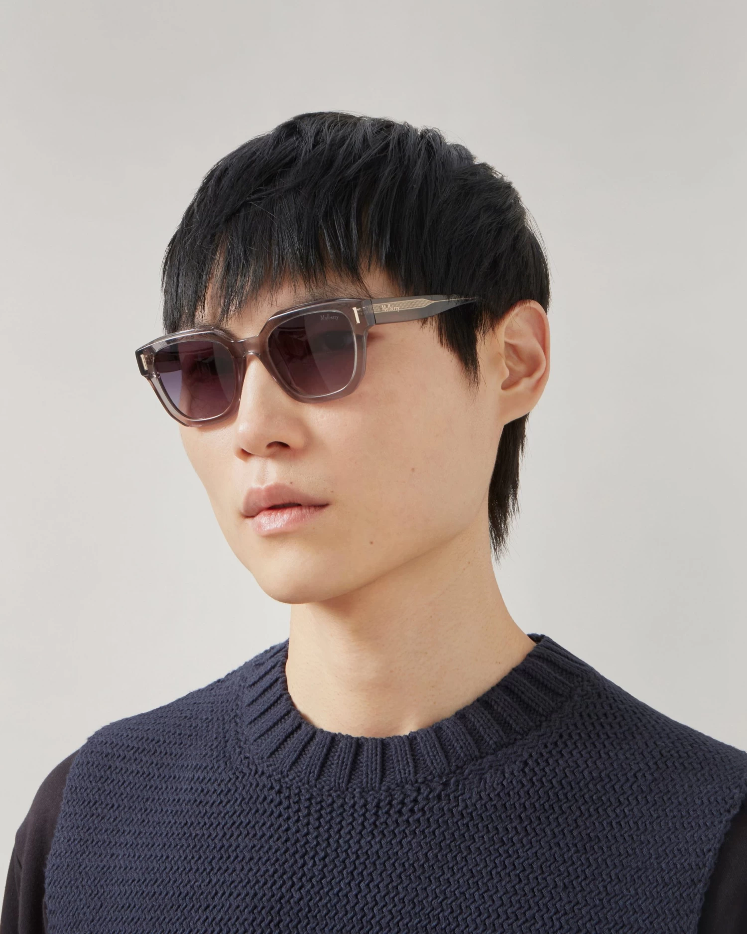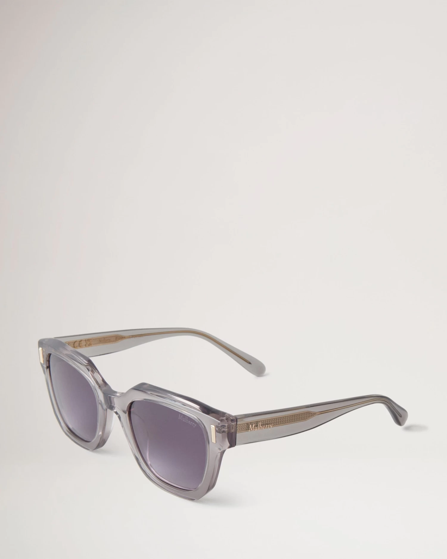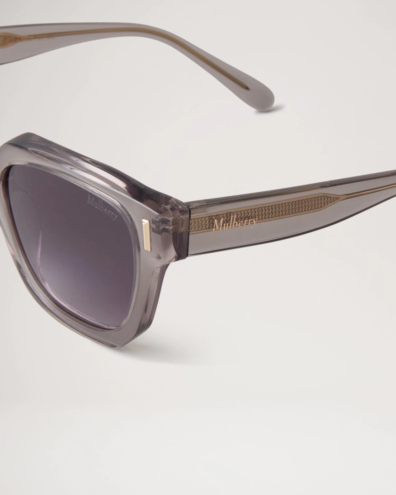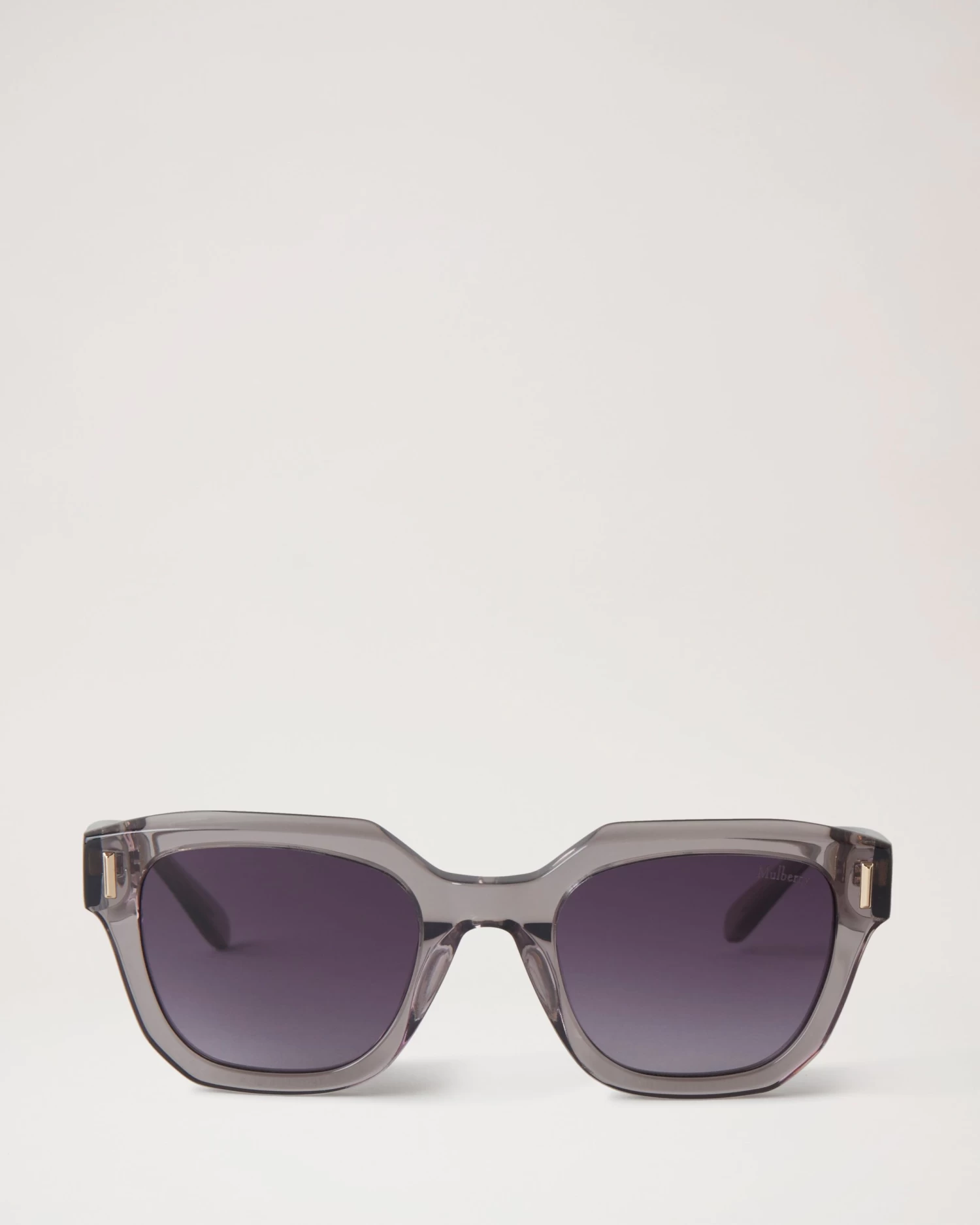 - Mulberry metallic branding at temples