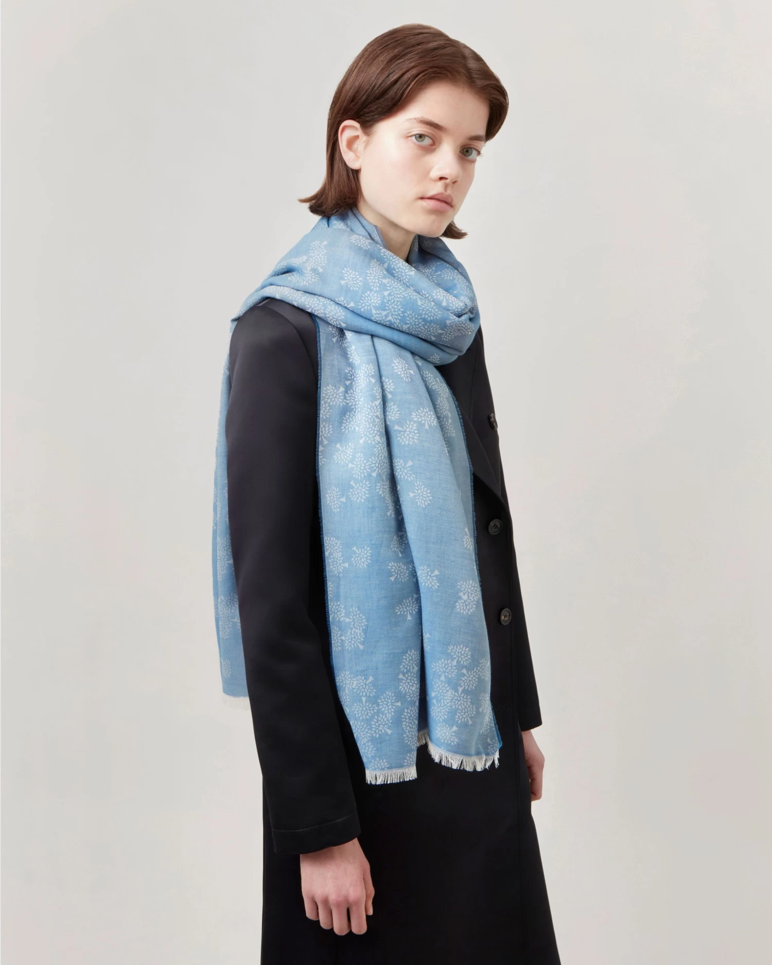 The Tamara scarf in Denim Blue. Wrap yourself up with a Mulberry tree motif and gorgeous soft fringing.