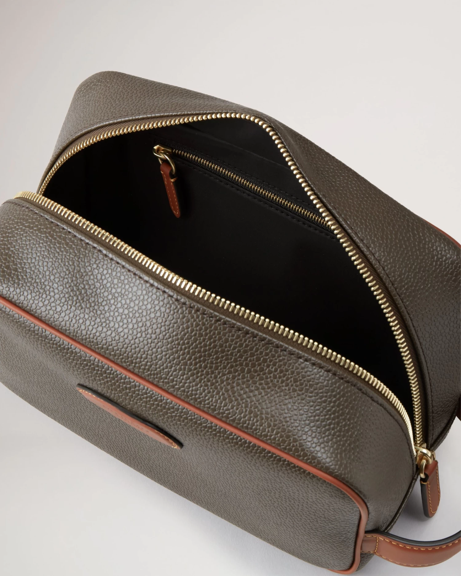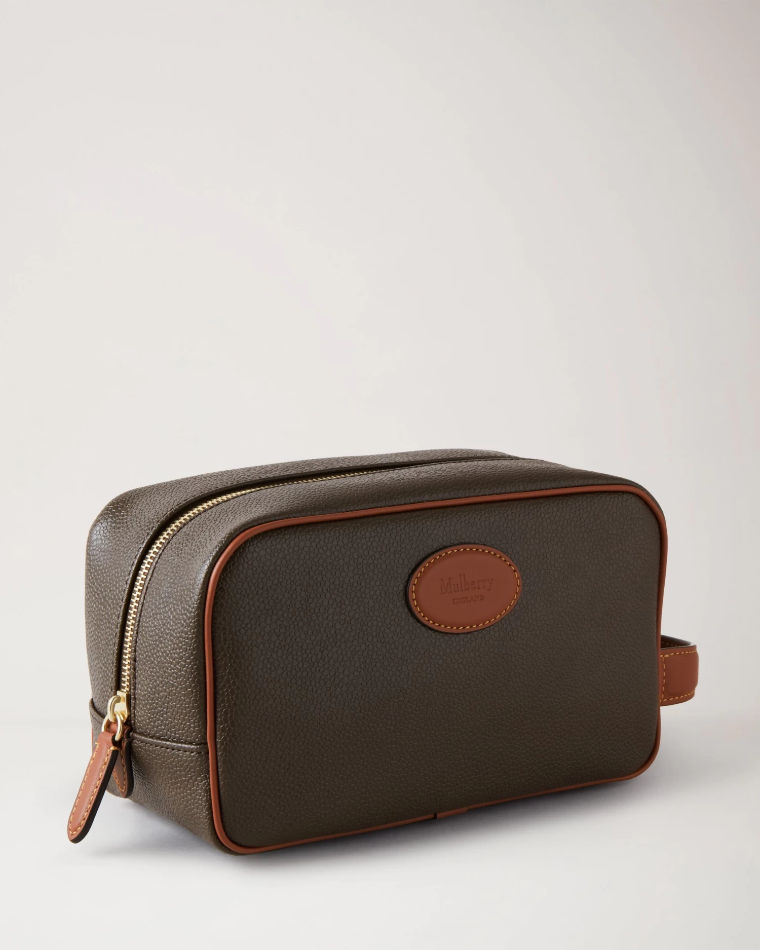 This classic wash case is the perfect companion to your travels. It features a convenient handle at one edge for easy toting. It is subtly embossed with the Mulberry signature logo at the side, nodding to a heritage of leather craft.