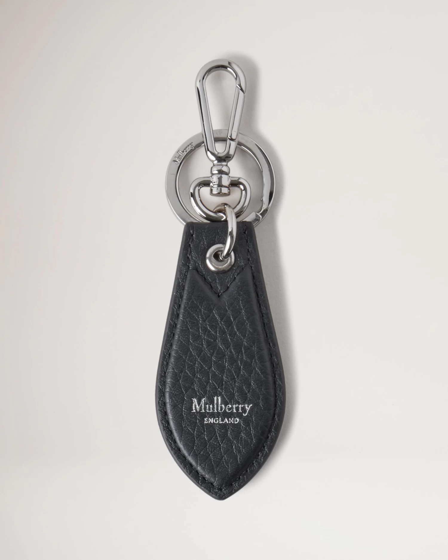 A simple leather tab keyring featuring a foil embossed Mulberry signature and finished with both a snap hook and split ring for ease and convenience.