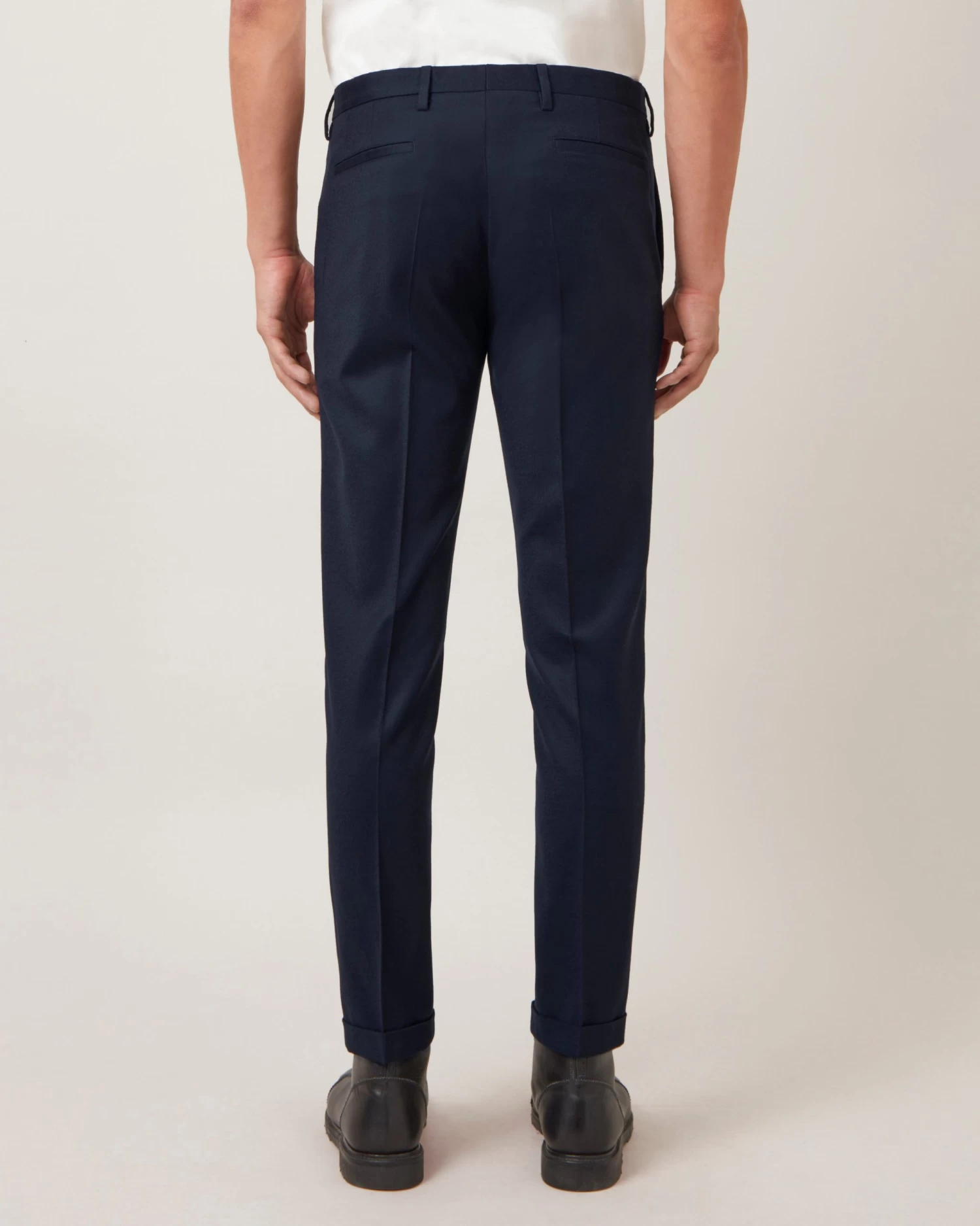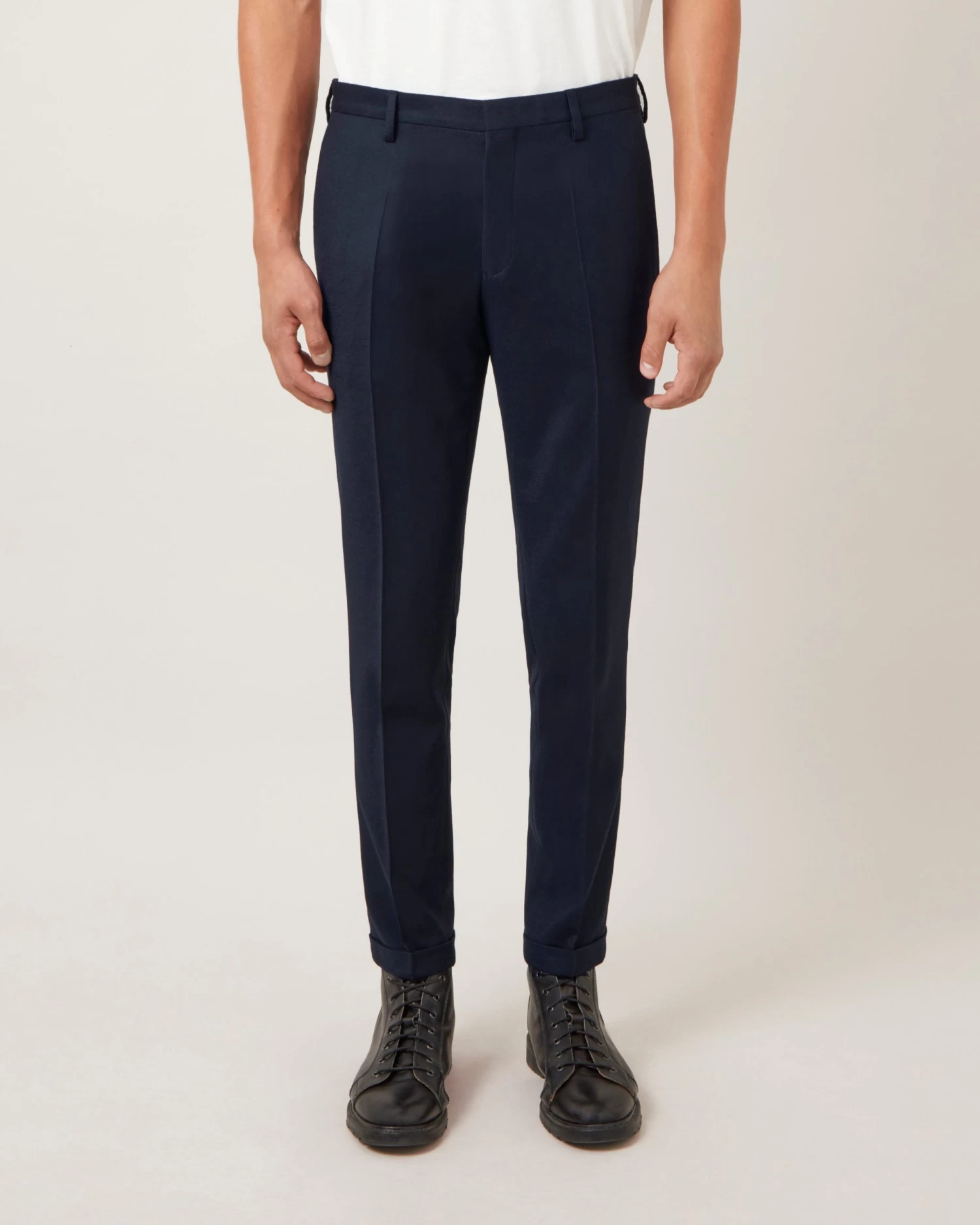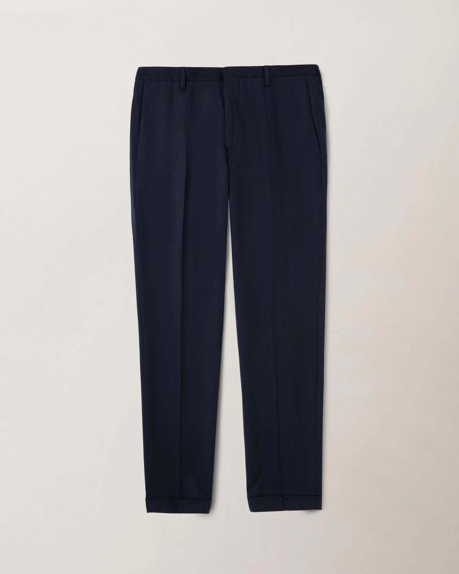 Made in Portugal from 100% wool, these slim-fit dark navy trousers are versatile enough for work or the weekend.