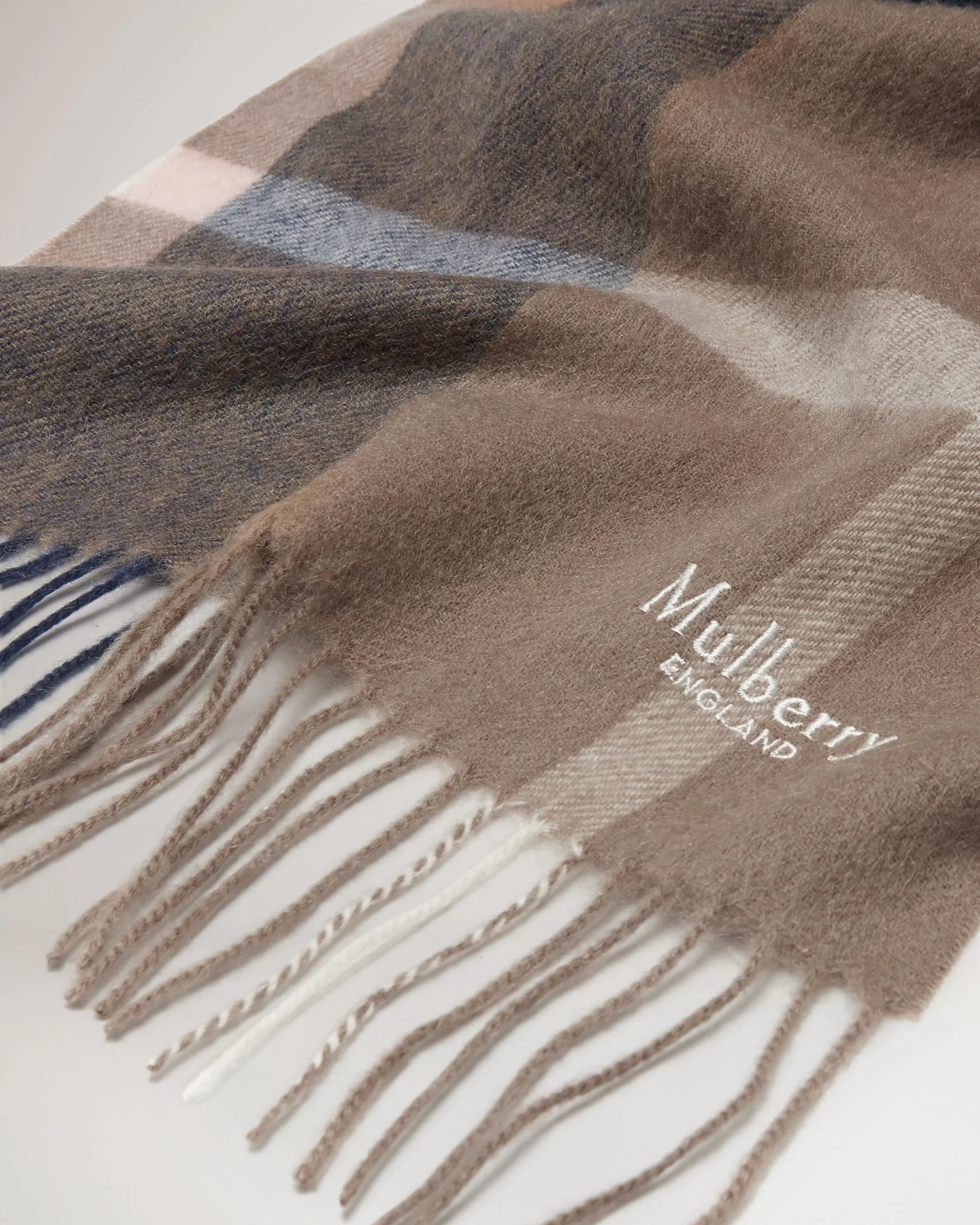 A classic woven checked scarf made in the UK from 100% Lambswool, finished with fringing and an embroidered Mulberry signature.