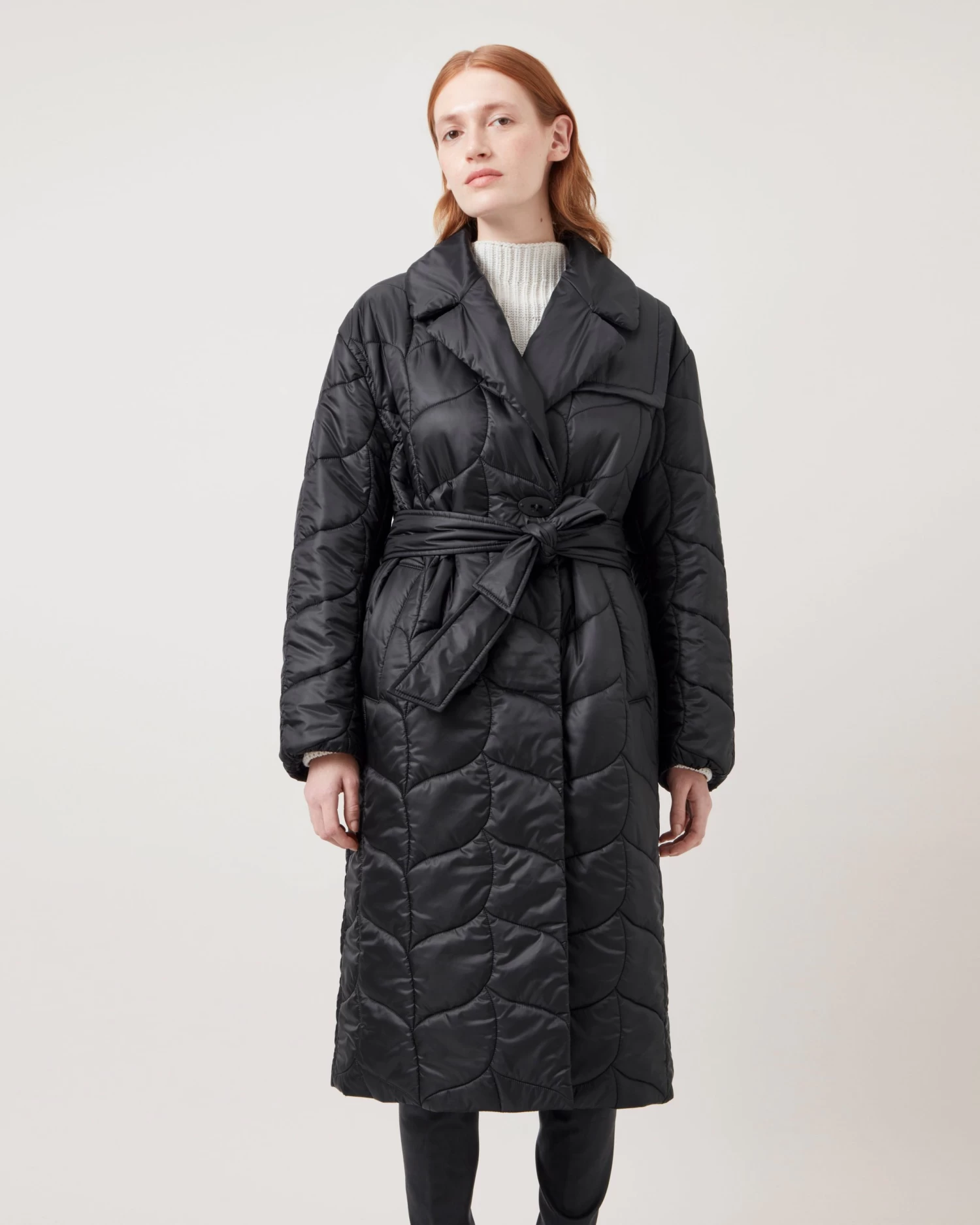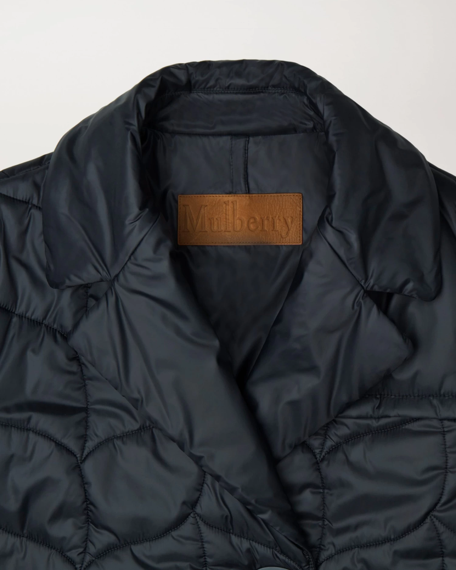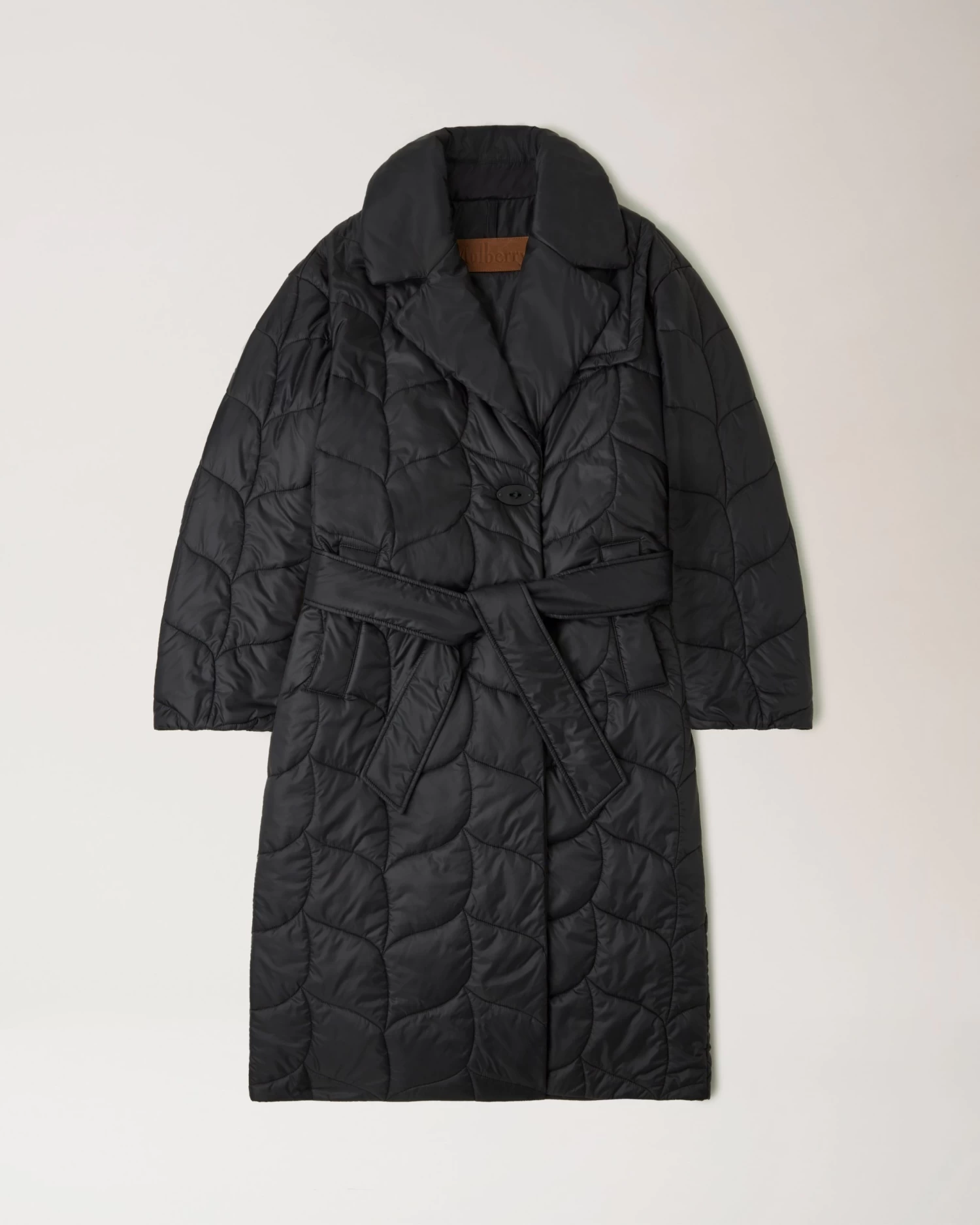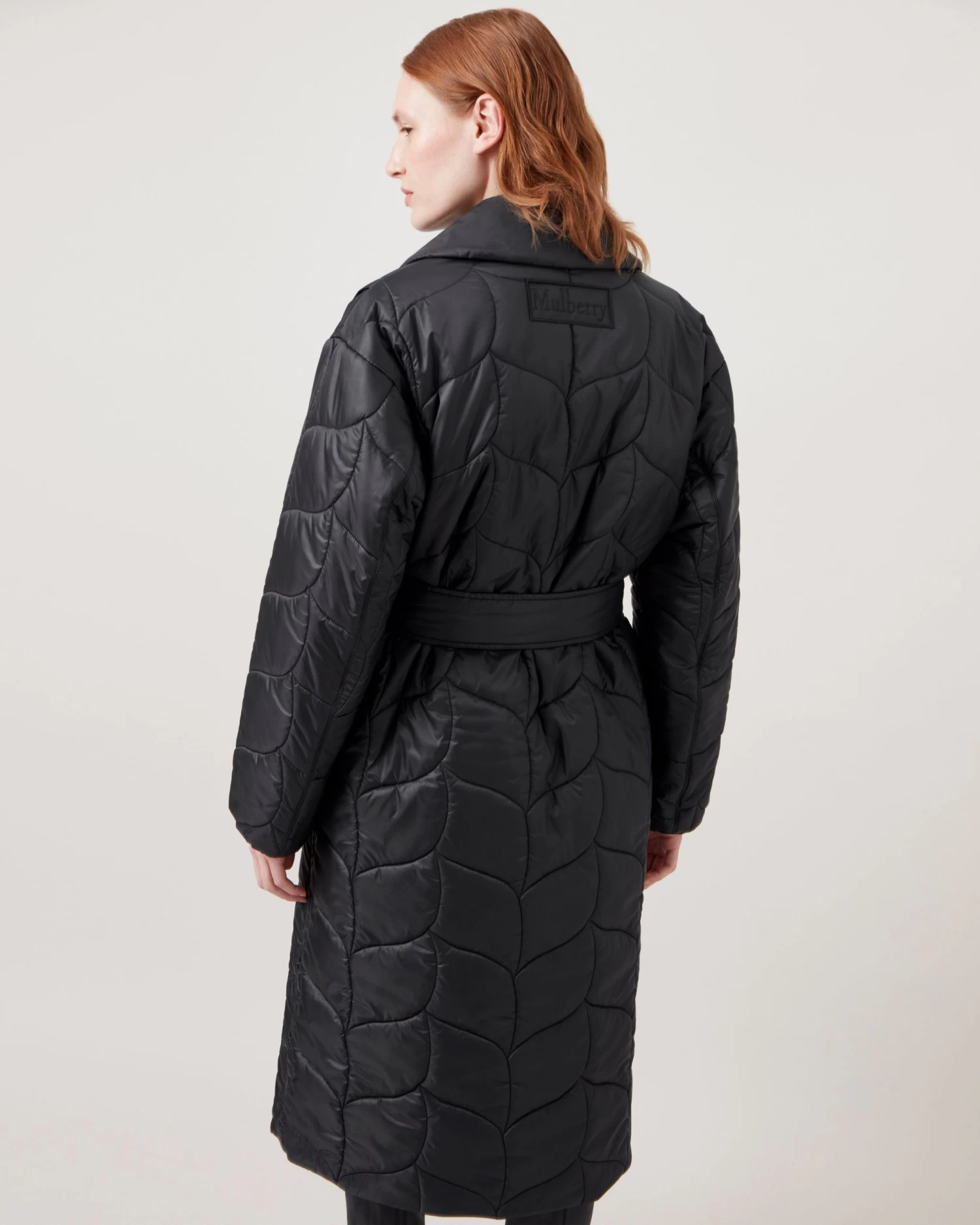 A full length Double Breasted Coat crafted from curve quilted Nylon.