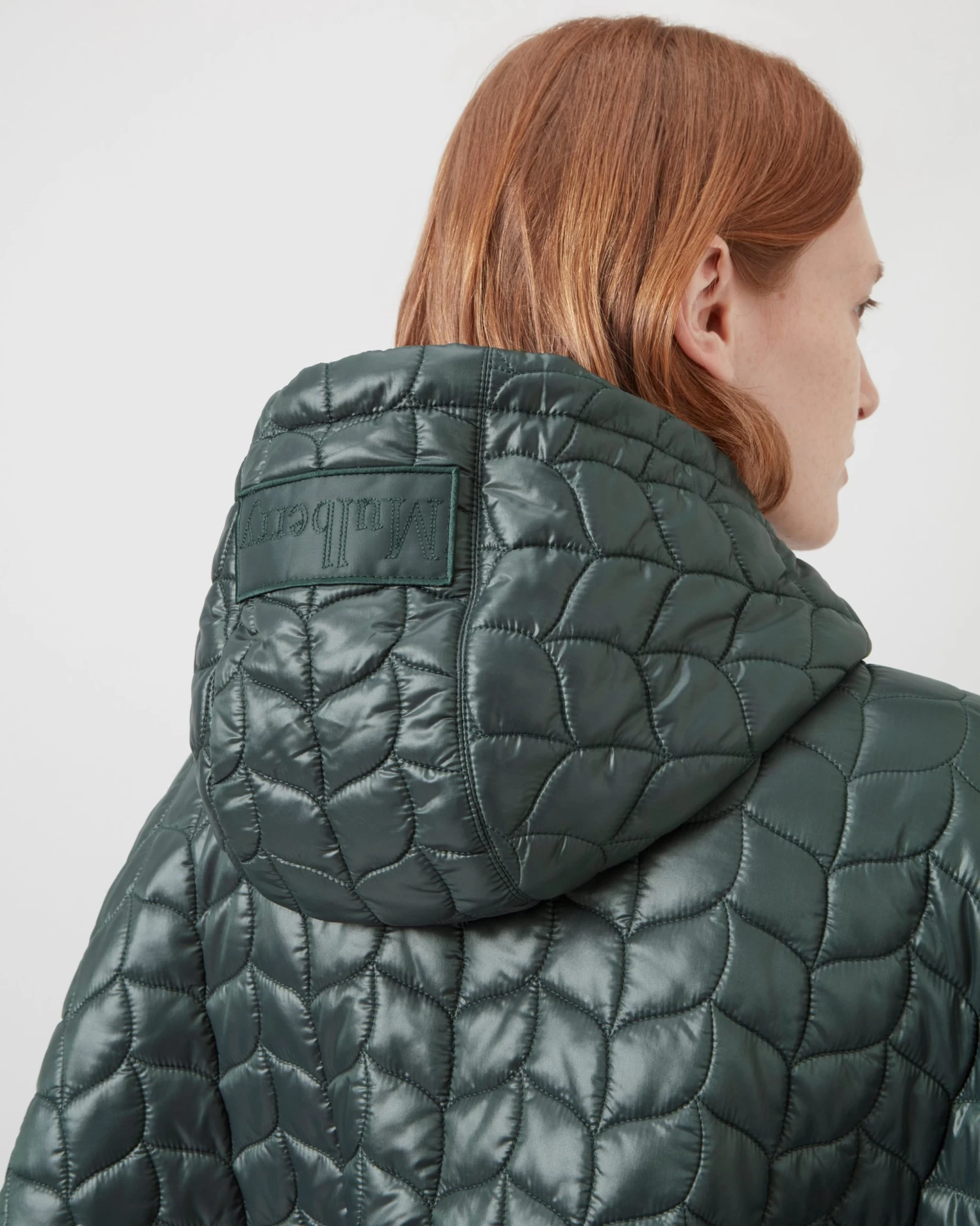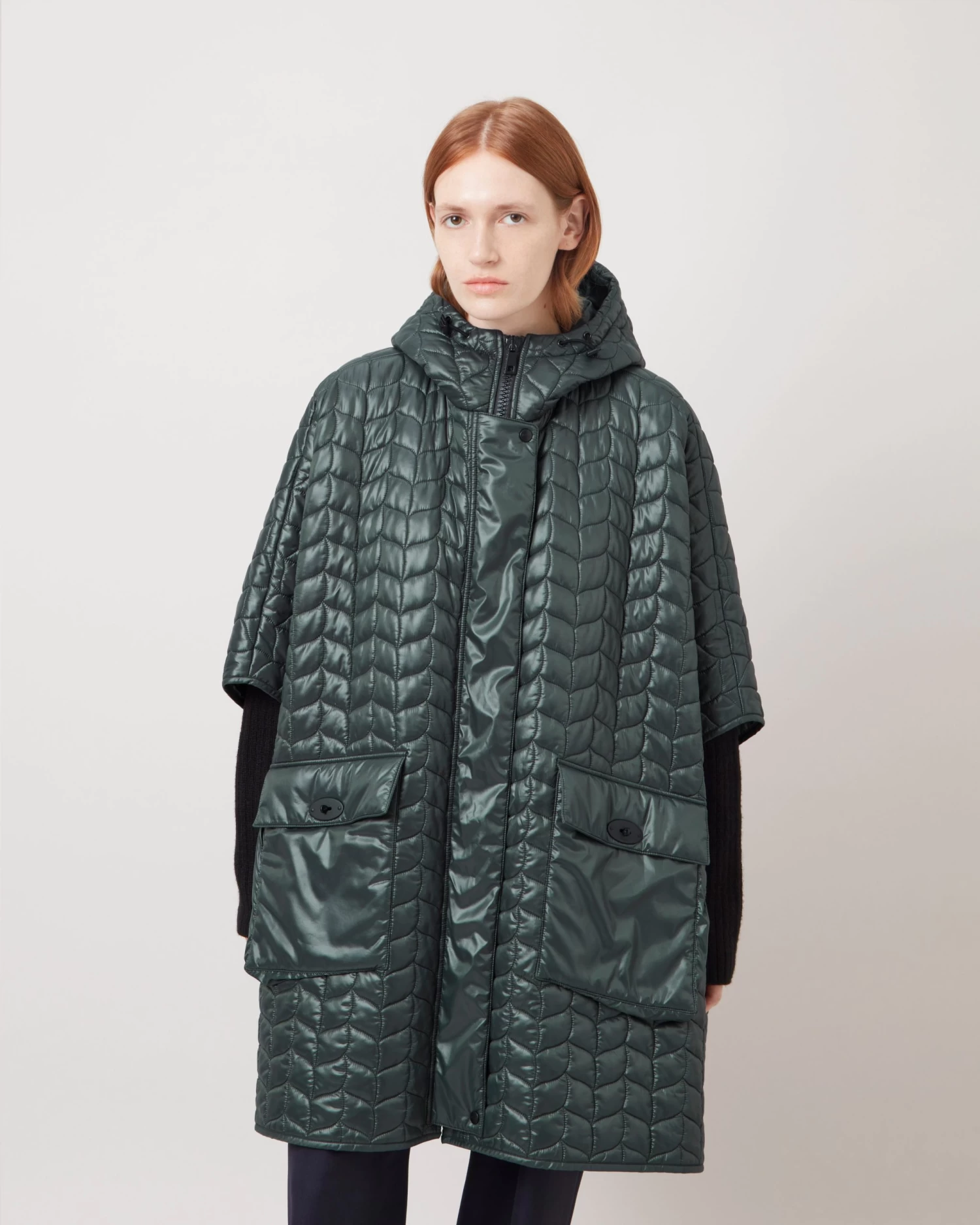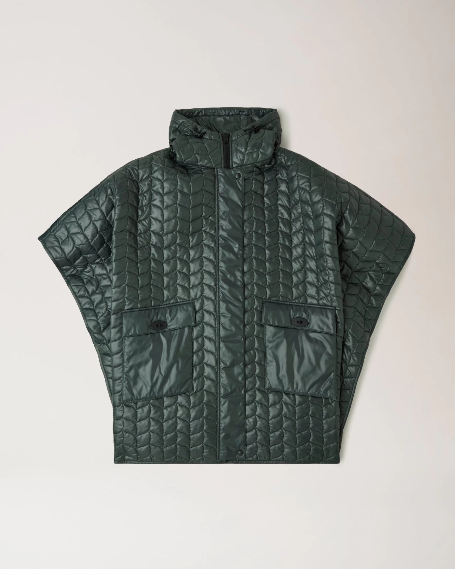 A contemporary take on the classic cape, with adjustable hood and curved quilted finish.