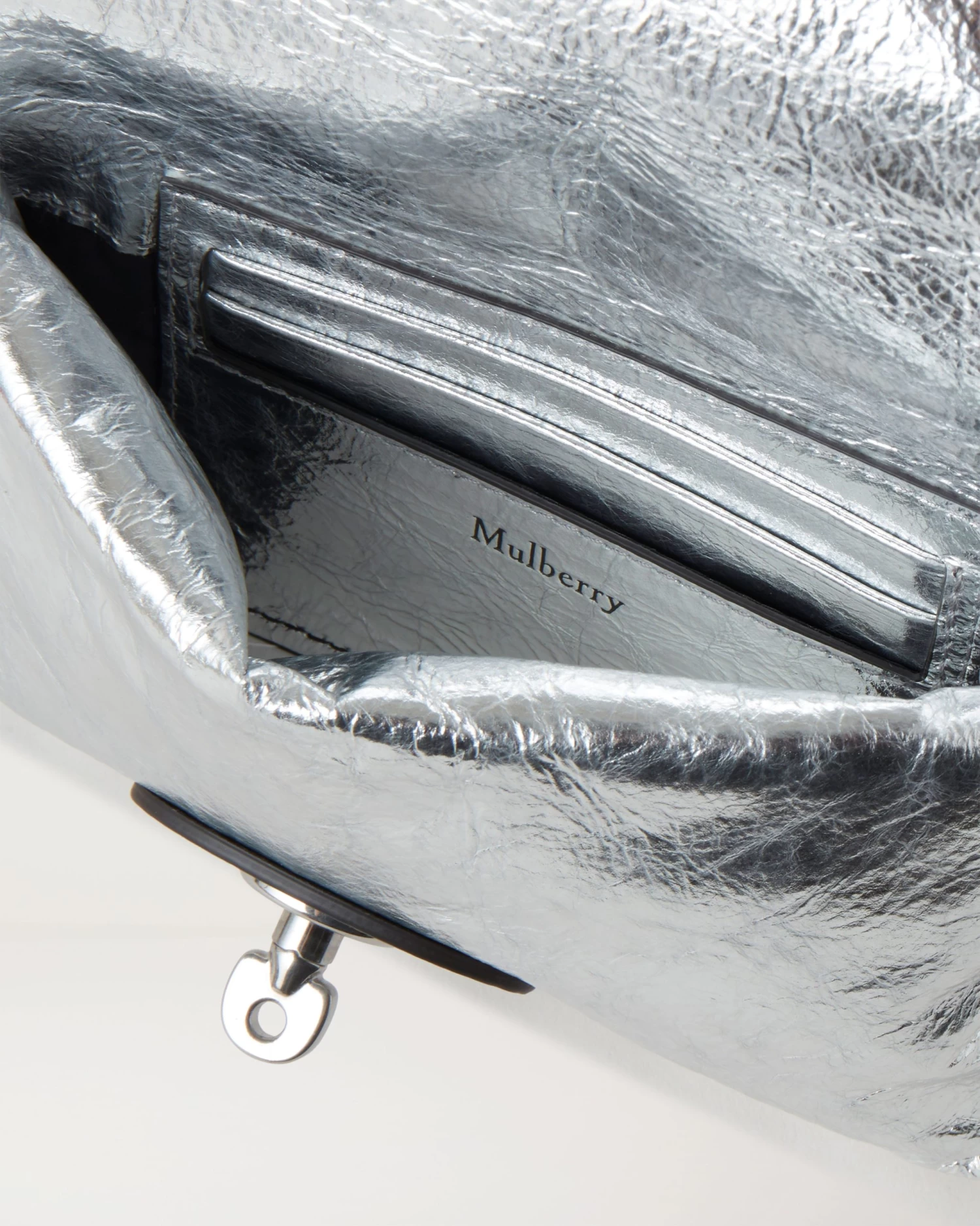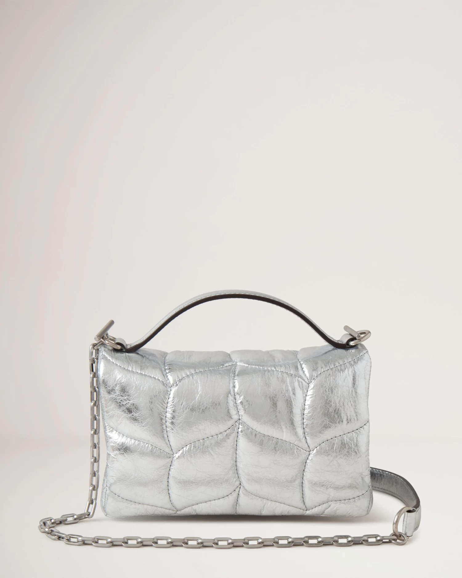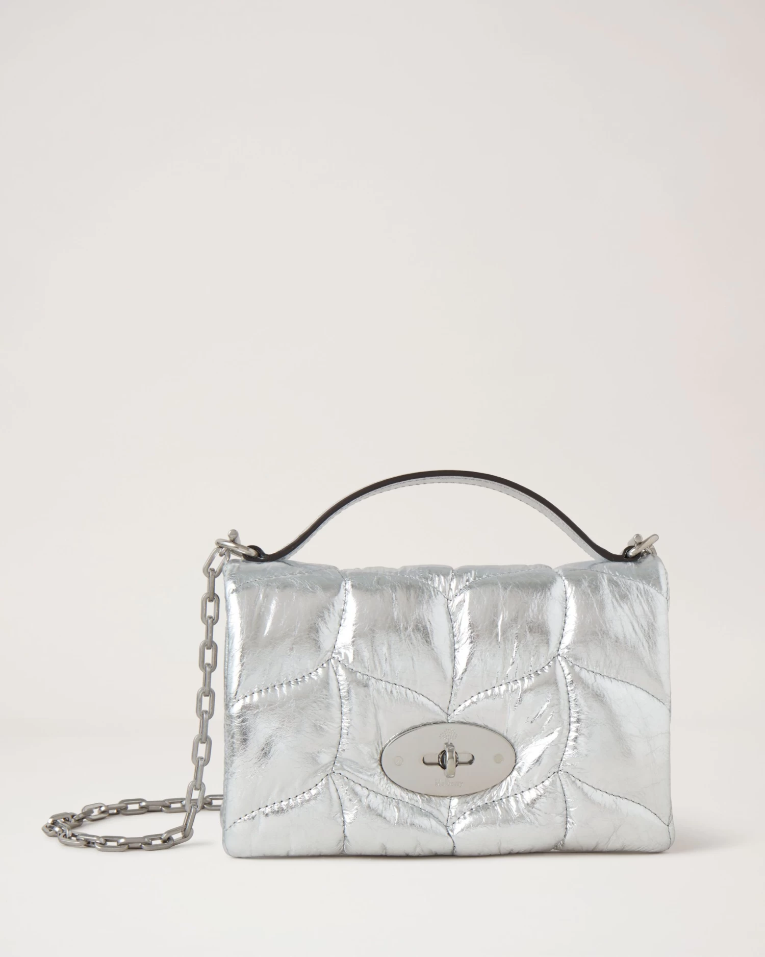 In line with Mulberry’s Made to Last manifesto, the Tiny Softie is made with Crinkled Metallic Leather from environmentally accredited tanneries and responsibly sourced down and feathers.